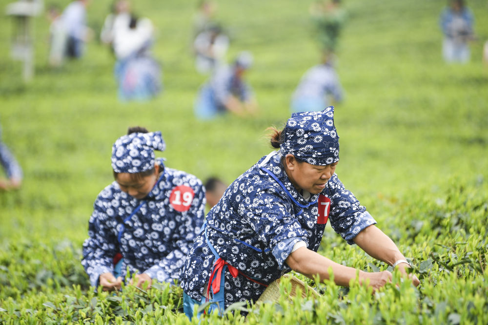 4月2日,第二届“永川秀芽杯”川渝合作泸永江产业带采茶大赛上,选手在重庆市永川区永荣镇白云寺村乡村振兴就业园茶叶采摘区采茶。新华社记者王全超 摄
