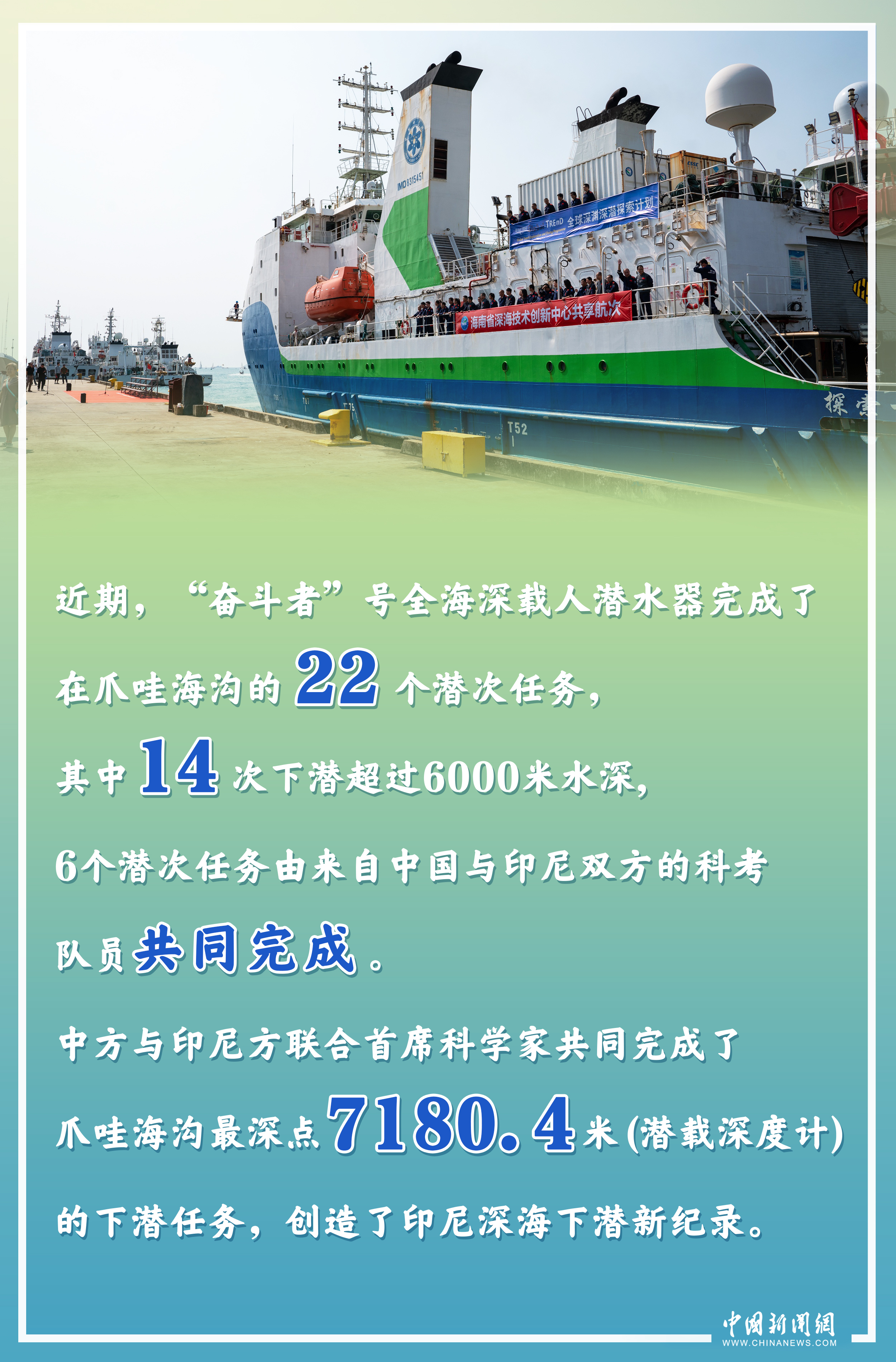 近期,“探索一号”科考船搭载着“奋斗者”号全海深载人潜水器,圆满完成首次中国-印度尼西亚爪哇海沟联合深潜科考航次任务,创造了印尼深海下潜新纪录,为两国加强海洋合作,开启了新篇章。