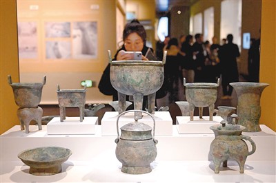 新馆里专设了“世界的商文明”展览。步入展厅,犹如穿越到世界各大文博机构。两侧墙体还原了加拿大皇家安大略博物馆、美国弗利尔美术馆等外国文博机构展出商代文物的场景。一张巨幅“商代文物海外收藏地图”,述说着大量青铜器、玉器、刻辞甲骨等商代文物流散海外的历史。
