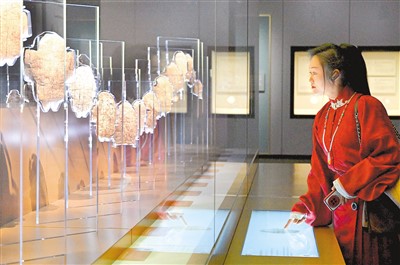 参观者在河南安阳殷墟博物馆新馆内观看展出的刻辞卜甲。新华社记者 李安摄