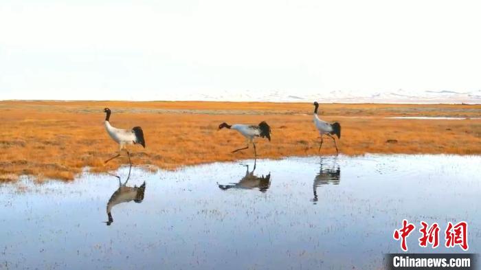 黑颈鹤是国家一级野生保护动物,是世界上唯一仅在高原繁殖生活的鹤类,而阿尔金山国家级自然保护区是黑颈鹤在我国最北端的栖息地之一,这里栖息着180只至220只黑颈鹤的繁殖种群。每年4月至5月,它们从越冬地回到保护区产卵、孵化,养育幼鸟。9月至10月,再“拖家带口”飞往越冬地。