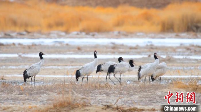 中新网乌鲁木齐4月8日电 (巴特尔达拉 曹玥)连日来,位于新疆若羌县境内的阿尔金山国家级自然保护区依协克帕提湖湿地,迎来大批迁徙归来的黑颈鹤栖息觅食。