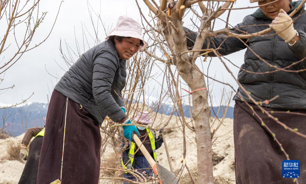 “这里以后也会成为桃花园!”56岁的嘎拉村村民尼玛曲吉说。在嘎拉村外尼洋河的河滩上,她和村民们正在种桃树,挖坑、正苗、培土,累了就唱几句藏歌。听到记者叫了一声“阿佳”(藏语大姐之意),尼玛曲吉热情招手。