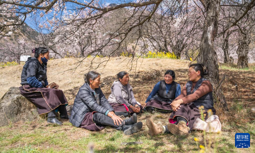 午休时,尼玛曲吉(右二)与村民在桃树下聊天(4月1日摄)。新华社记者 丁增尼达 摄