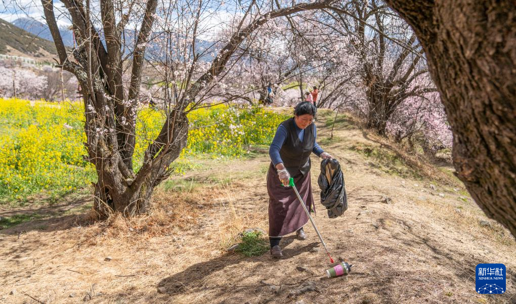 尼玛曲吉在嘎拉村桃花园里捡拾垃圾(4月1日摄)。新华社记者 丁增尼达 摄