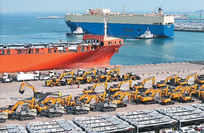 连日来,山东港口烟台港汽车出口发运迎来作业高峰。汽车运输船密集抵港,数千辆商品车集结装船,一派繁忙景象。图为一批汽车和工程机械在山东港口烟台港等待装船出口。唐 克摄(人民视觉)
