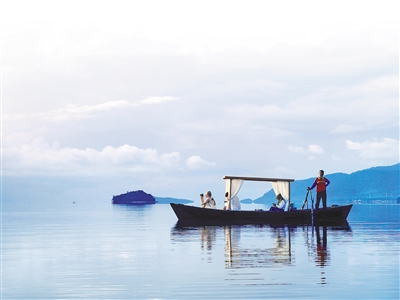 中国游客在泰国南部甲米府兰塔岛近海搭乘小船拍摄日出。
