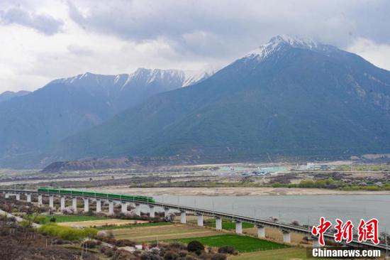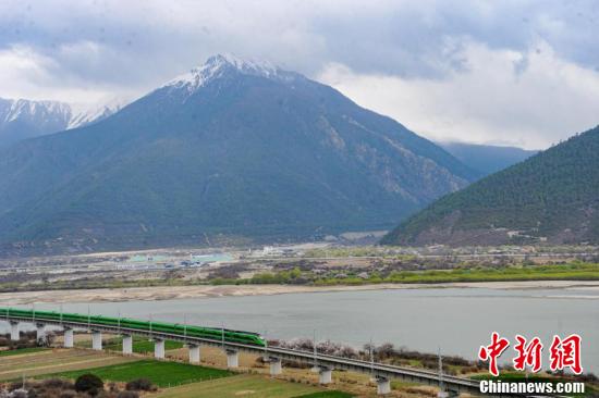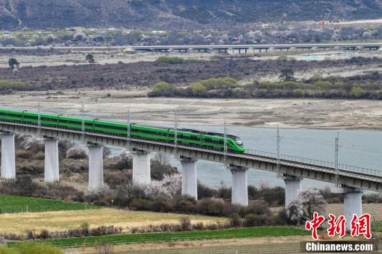 据悉,拉林铁路是一条连接西藏拉萨市与林芝市的国铁Ⅰ级单线电气化铁路,全长435公里,设计时速160公里,于2021年6月25日开通运营。图为穿梭在桃花林中的拉林铁路高原复兴号。
