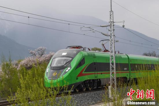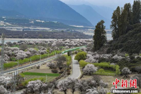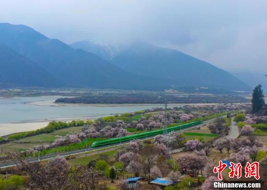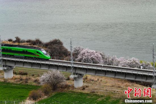 复兴号动车组不仅是一种便捷的交通方式,更成为了一种独特的旅游体验,让游客能够近距离欣赏到西藏林芝春季独特的自然美景。图为穿梭在桃花林中的拉林铁路高原复兴号。