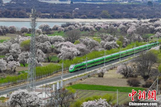 穿梭在桃花林中的拉林铁路高原复兴号。