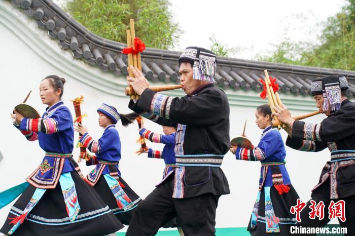 4月11日,2024年“广西三月三·八桂嘉年华”文化旅游品牌活动在南宁市青秀山风景区开幕,表演者在演奏芦笙等乐器。陈冠言 摄