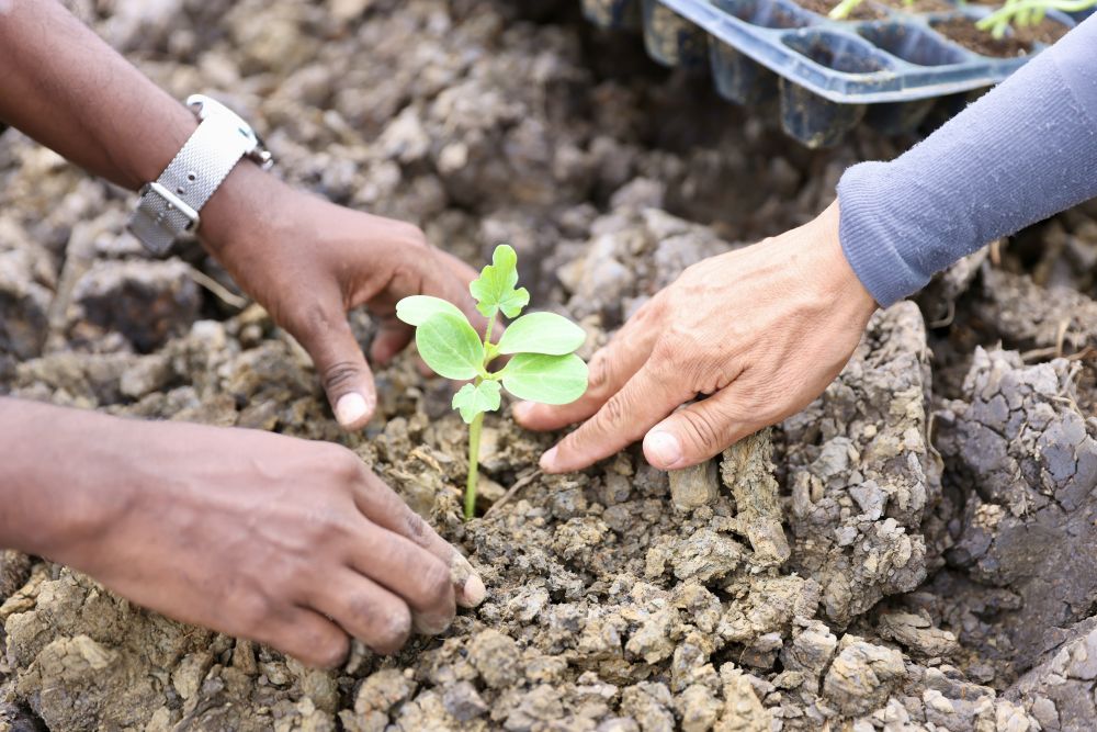 4月5日,农户阿什温·杜基与中国农业技术专家一起把西瓜秧苗移栽到田地里。