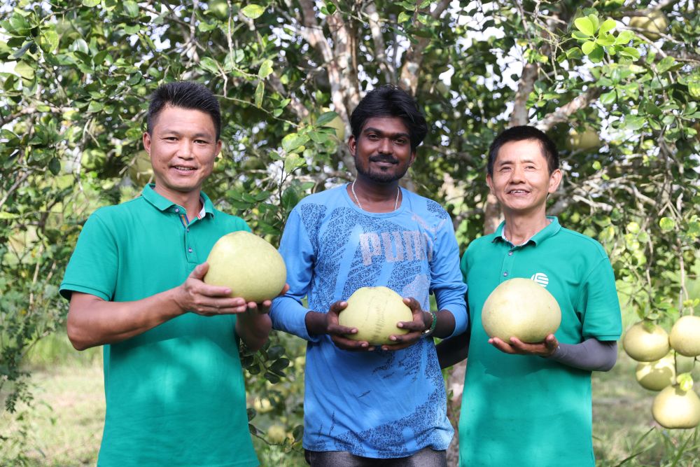 4月5日,苏里南农户阿什温·杜基(中)同中国农业技术专家展示丰收的柚子。