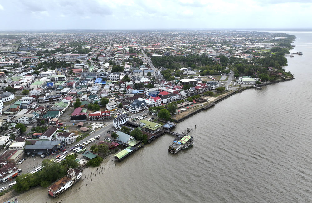 4月6日,在苏里南首都帕拉马里博拍摄的苏里南河沿岸景观(无人机照片)。