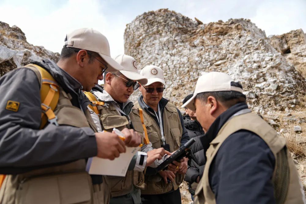 4月11日,普查人员在曲果岗塔群遗址现场开展数据采集。新华社记者 晋美多吉 摄