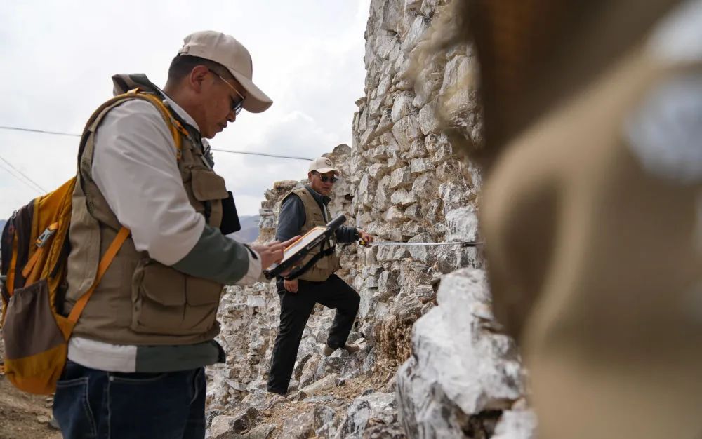 4月11日,普查人员手持移动端数据采集设备在曲果岗塔群遗址现场开展数据采集。新华社记者 晋美多吉 摄