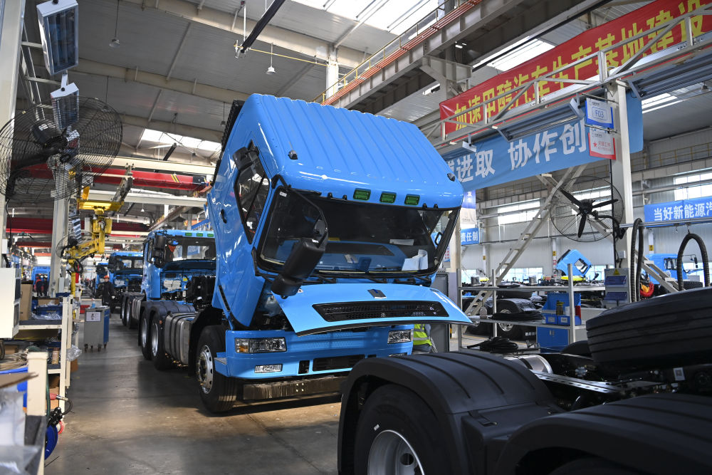 这是在位于山西省晋中市榆次区的山西新能源汽车工业有限公司(吉利晋中基地)拍摄的甲醇重卡(4月1日摄)。新华社记者 杨晨光 摄
