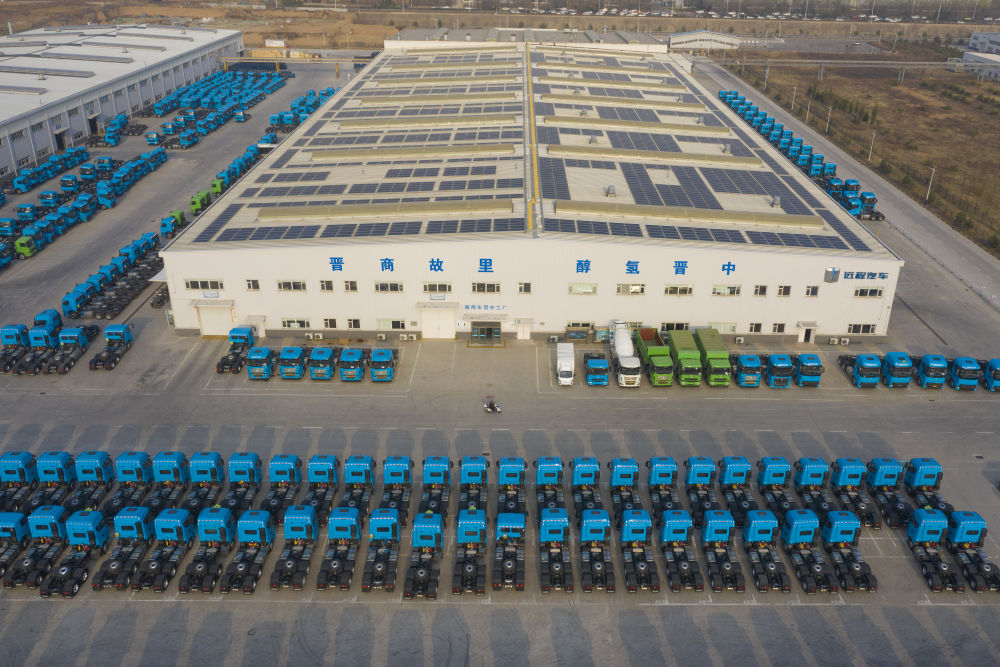 这是在位于山西省晋中市榆次区的山西新能源汽车工业有限公司(吉利晋中基地)拍摄的甲醇重卡(4月1日摄,无人机照片)。新华社记者 杨晨光 摄