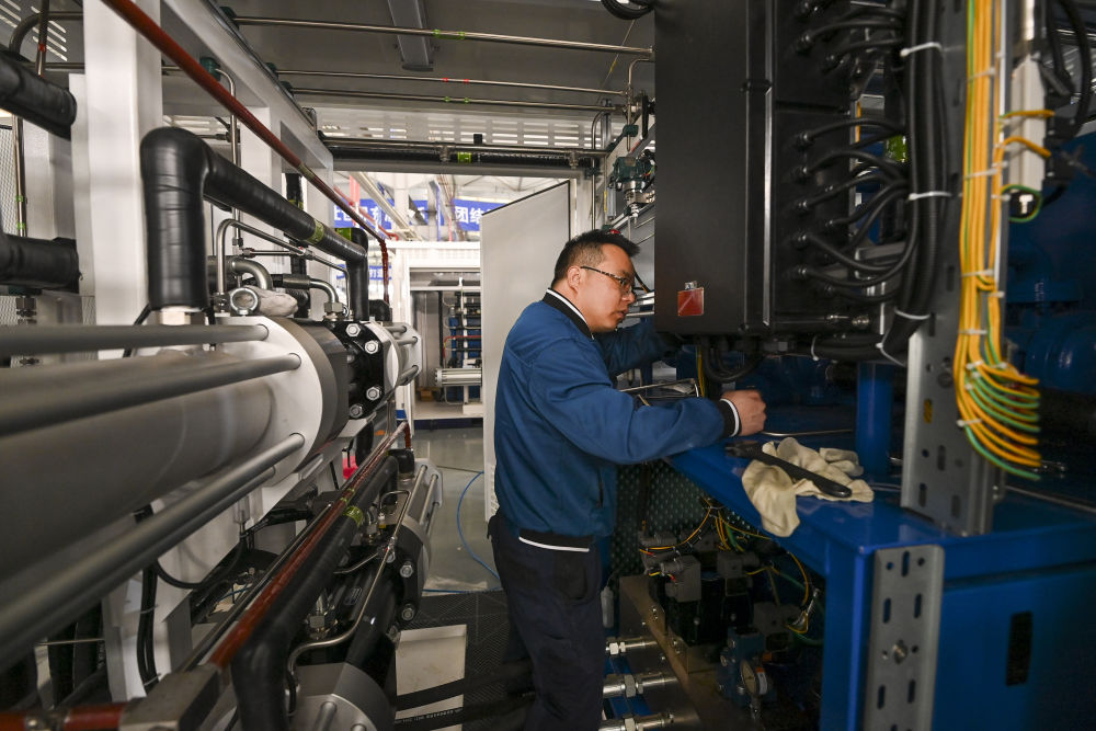 在位于山西省长治市高新技术产业开发区科技工业园的一家公司内,工作人员在调试氢能设备(4月2日摄)。新华社记者 杨晨光 摄