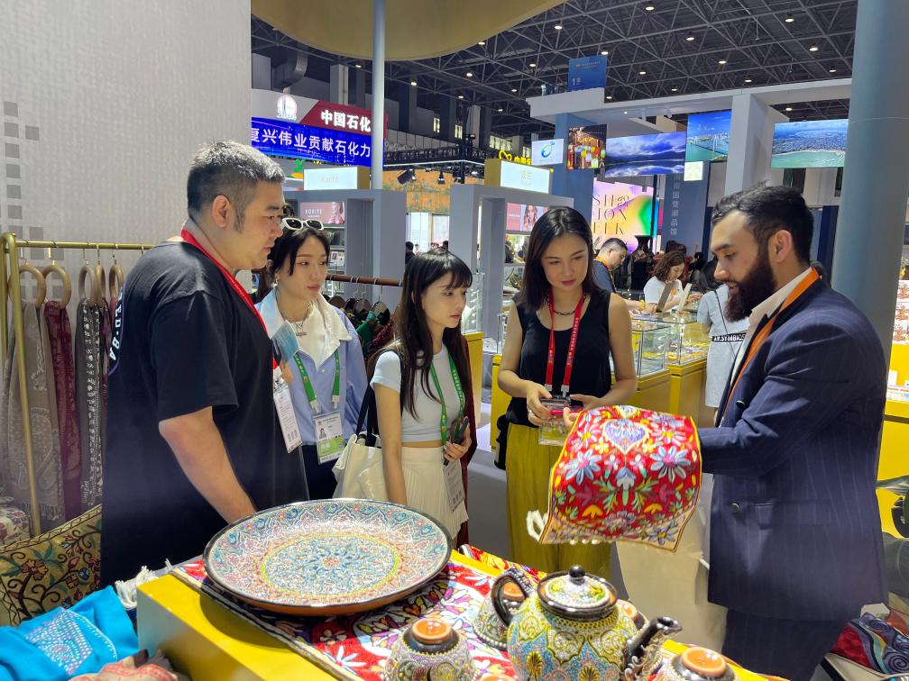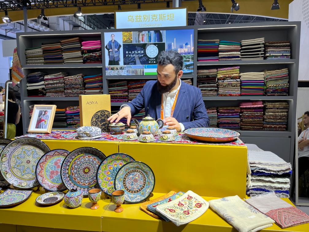 “这些都是乌兹别克斯坦的传统手工艺品,每一件产品上的图案都是独一无二的。”乌兹别克斯坦小伙阿森贝克用一口流利的汉语向客商介绍展台上的产品。