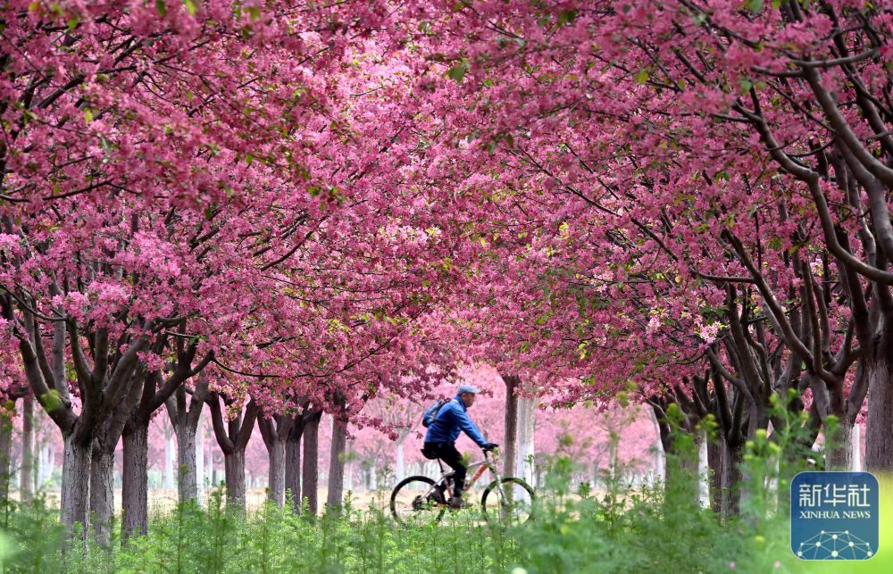 4月8日,游客在河北省邯郸市峰峰矿区义井镇万亩秀林中盛开的海棠花间骑行。新华社发(郝群英 摄)