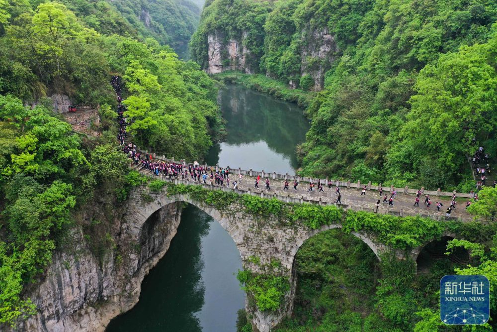 4月12日,贵州省福泉市第四小学的学生在葛镜桥参加研学活动(无人机照片)。新华社发(肖伟 摄)