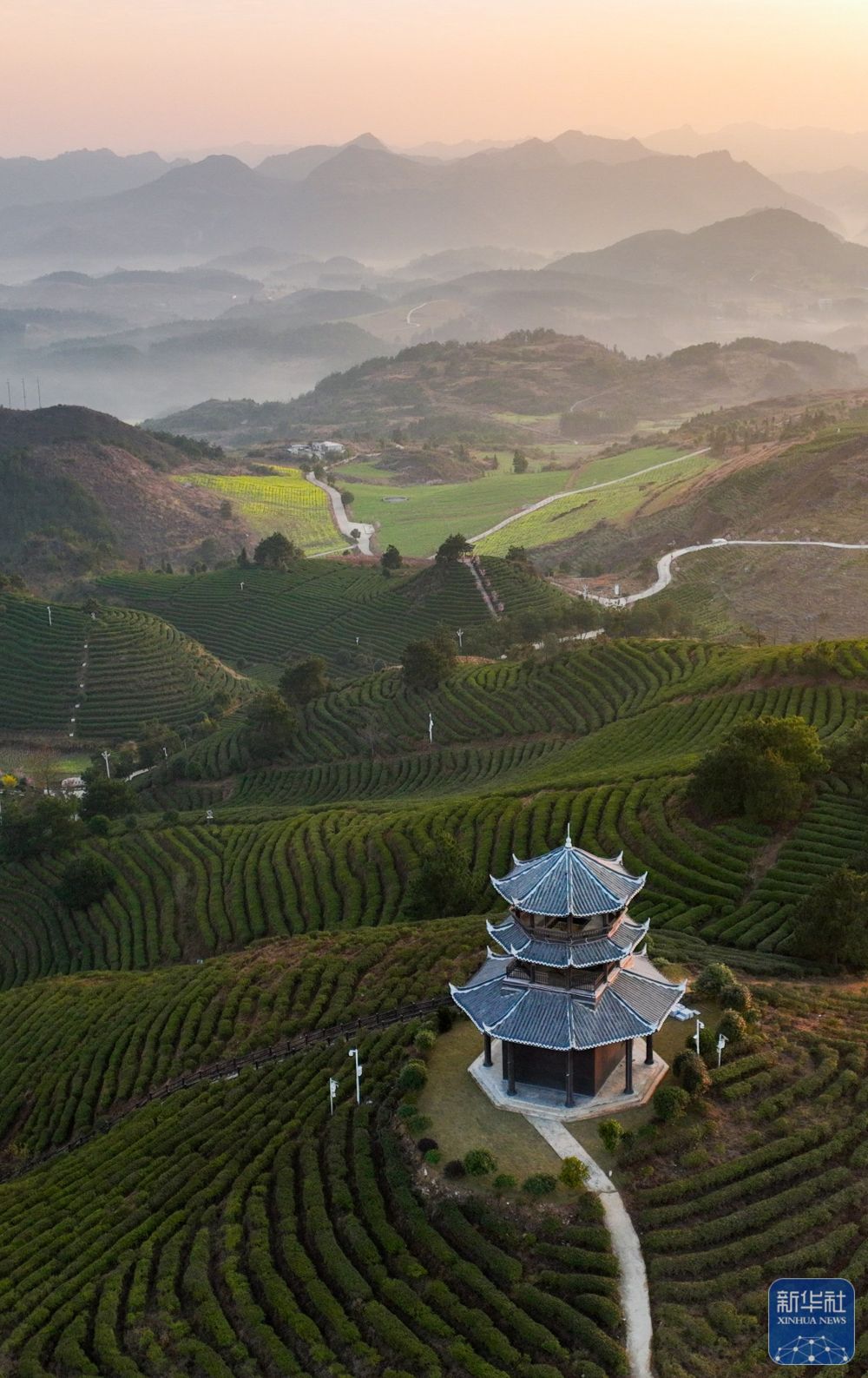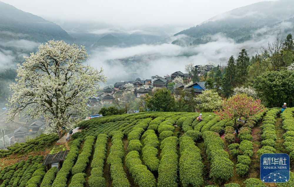 3月12日拍摄的贵州省黔东南苗族侗族自治州丹寨县龙泉镇马寨村茶园春景(无人机照片)。新华社发(杨武魁 摄)
