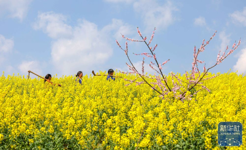 3月23日,在贵州省铜仁市玉屏侗族自治县朱家场镇混寨村,村民扛着农具准备劳作。新华社发(胡攀学 摄)