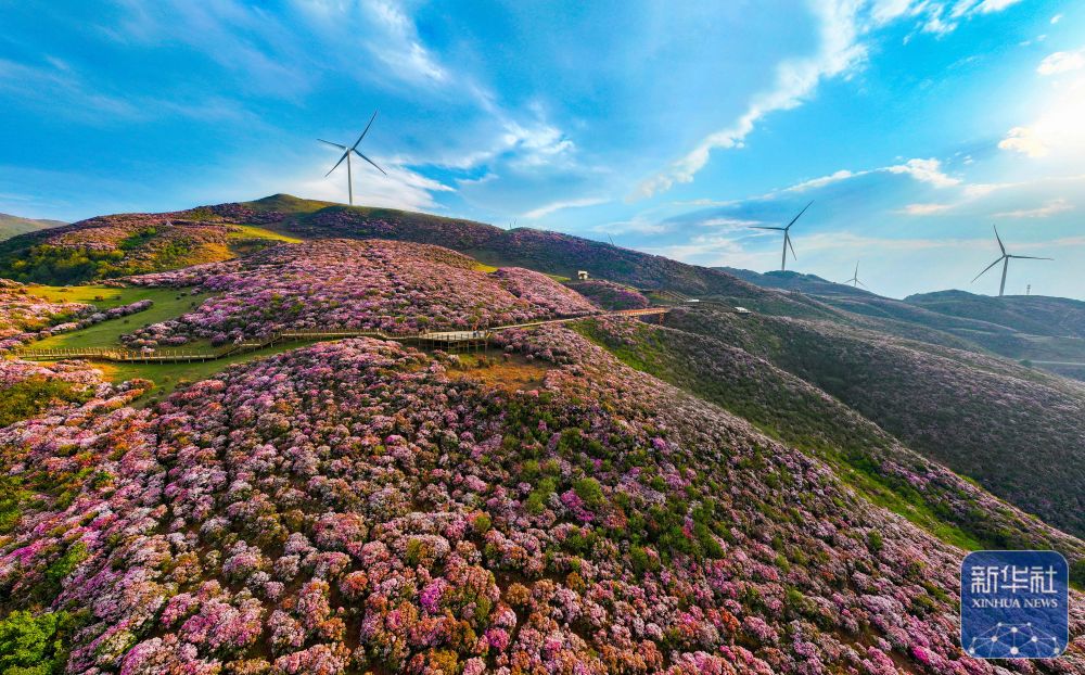 4月12日,贵州省六盘水市乌蒙大草原景区内的高原矮杜鹃竞相绽放(无人机拼接照片)。新华社发(尚宇杰 摄)