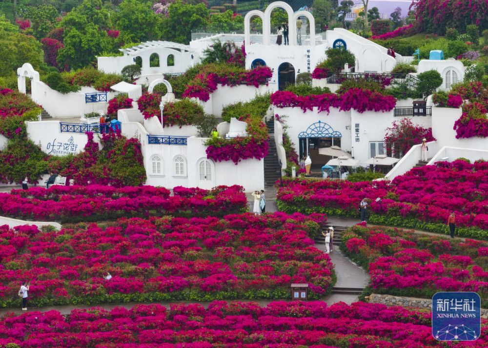 4月10日,游客在广西南宁青秀山景区内的叶子花园观光游览(无人机照片)。新华社发(刘峥 摄)