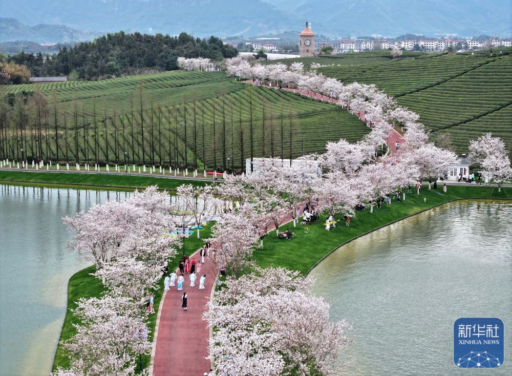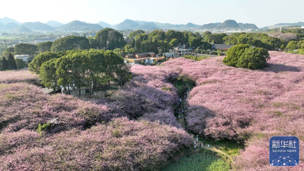 3月24日,游客在贵州省清镇市红枫湖镇右二村赏花游玩(无人机照片)。新华社发(袁福洪 摄)