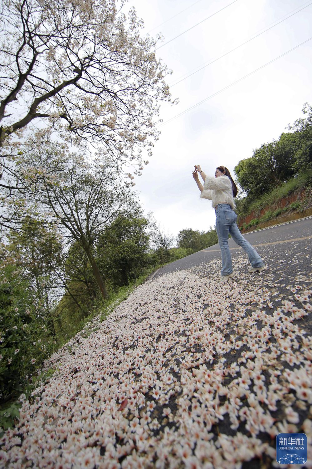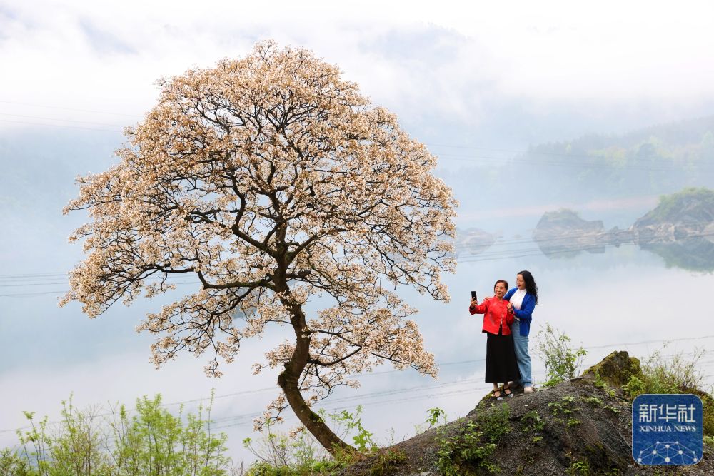 4月12日,游客在贵州省铜仁市玉屏侗族自治县茶花泉景区拍摄桐子花。新华社发(刘德军 摄)