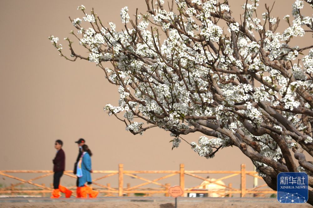 4月11日,游客在梨花开放的甘肃省敦煌市鸣沙山月牙泉景区游览。新华社发(张晓亮 摄)