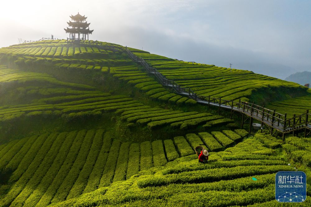 4月12日,茶农在湖北省宣恩县万寨乡伍家台村的茶园里采摘春茶(无人机照片)。新华社发(陈绪开 摄)