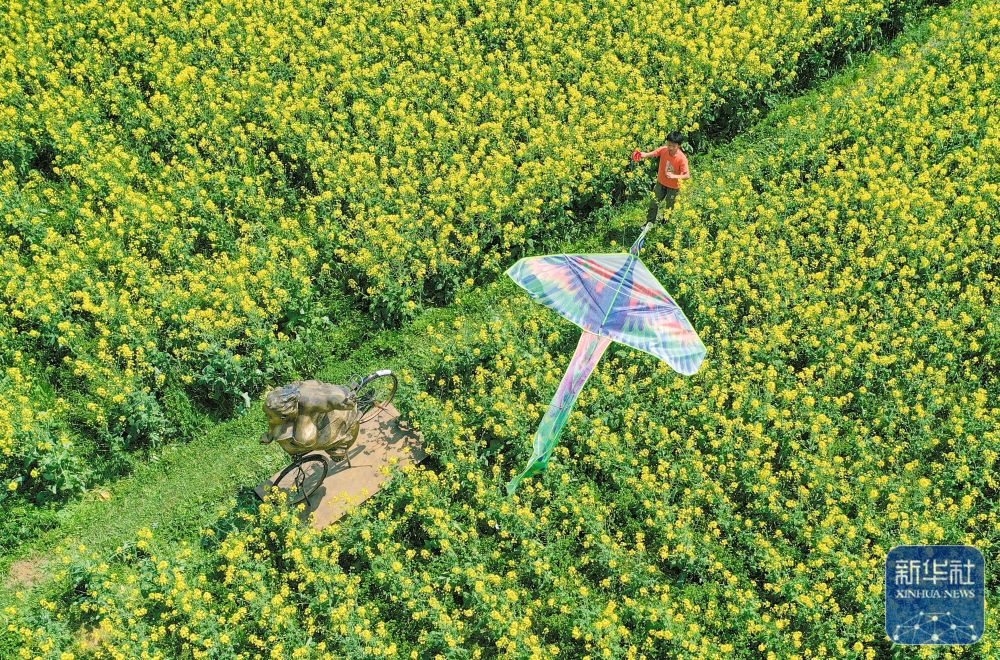 3月24日,游客在贵州省遵义市汇川区油菜花田放风筝(无人机照片)。新华社发(田成 摄)