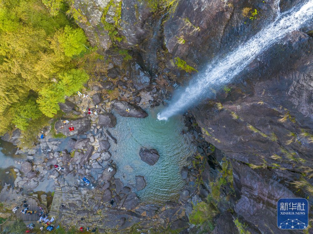 3月23日,游客在浙江省宁波市宁海县雁苍山一处瀑布下游玩(无人机照片)。新华社发(胡学军 摄)