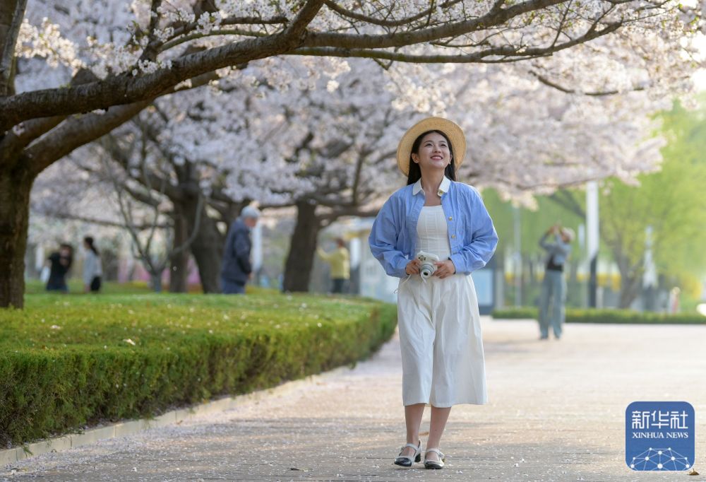 4月8日,游客在山东省胶州市三里河公园踏青赏花。新华社发(王昭脉 摄)