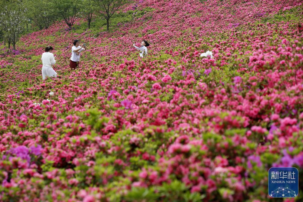 4月10日,在浙江省温岭市一处公园,游客在杜鹃花海里赏景拍照。新华社发(周学军 摄)