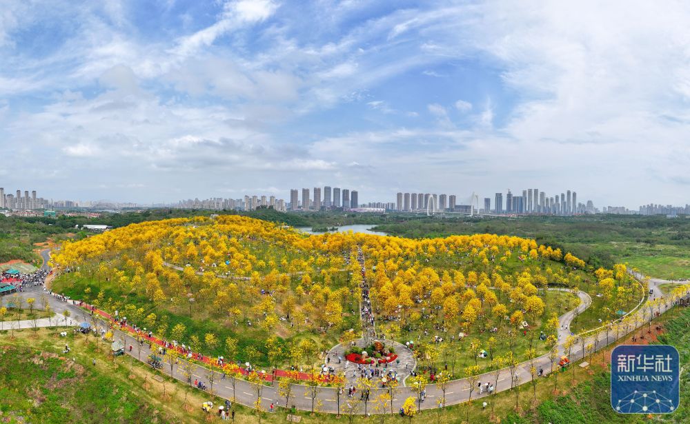 3月23日,游人在广西南宁青秀山景区风铃谷观赏黄花风铃木(无人机全景照片)。新华社发(喻湘泉 摄)