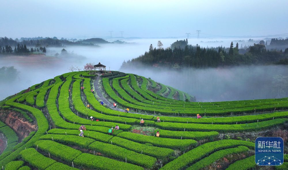 3月28日,在四川省泸州市纳溪区大渡口镇凤凰湖村拂羽茶园,村民忙着采摘春茶(无人机照片)。新华社发(刘学懿 摄)