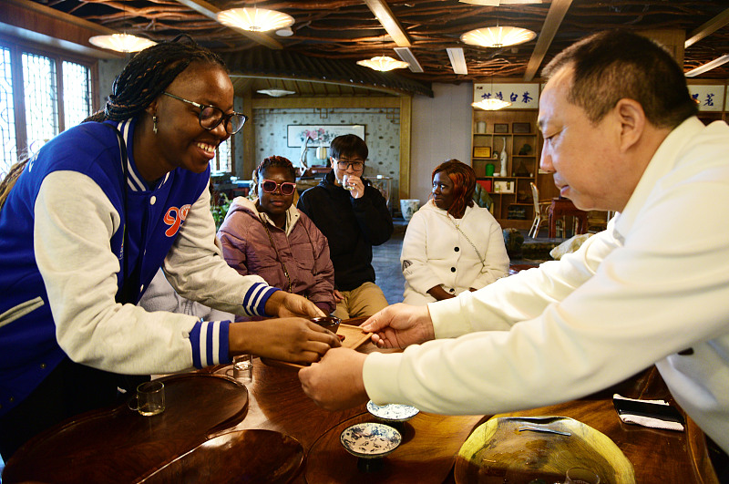 2024年4月13日,江苏科技大学的中外大学生跟随茶艺师体验茶艺。(图源:视觉中国)