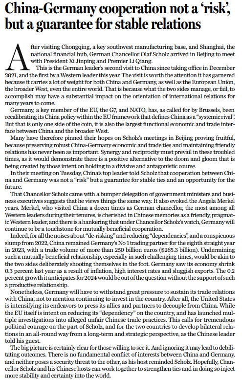 实际上,近年来“去风险”和减少“依赖”的声音不断,尽管如此,2023年德国和中国的双边贸易额仍超2500亿欧元(2653亿美元),中国更是连续第8年成为德国最重要的贸易伙伴。破坏这样互惠互利的双边关系,尤其是在如今这样充满挑战的时刻,无异于搬起石头砸自己的脚。2023年,由于高通胀、高利率和出口低迷,德国经济同比下降0.3%。2024年,德国经济预计增长0.2%,但如果没有像中德这样富有成效的关系的支持,这一增长预期或将很难达到。