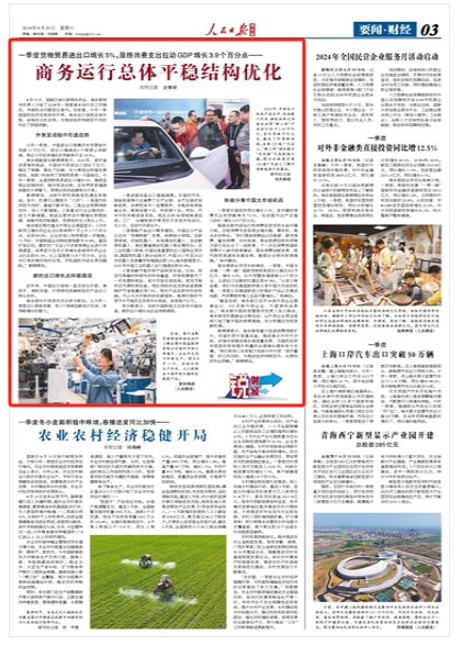 4月19日,国新办举行新闻发布会,商务部相关负责人介绍了2024年一季度商务运行及工作情况,并就热点问题答记者问。总体看,今年一季度国民经济实现良好开局,商务运行呈现总体平稳、结构优化的态势,为推动经济持续回升向好作出了积极贡献。