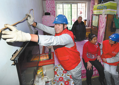 郭家爱心团队队员为盲人居民重新布置室内电线,确保用电安全。