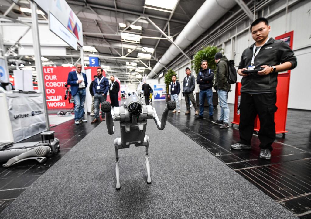 4月22日,在德国汉诺威工博会上,杭州宇树科技有限公司参展商(右一)在展示一款机器狗。新华社记者任鹏飞摄