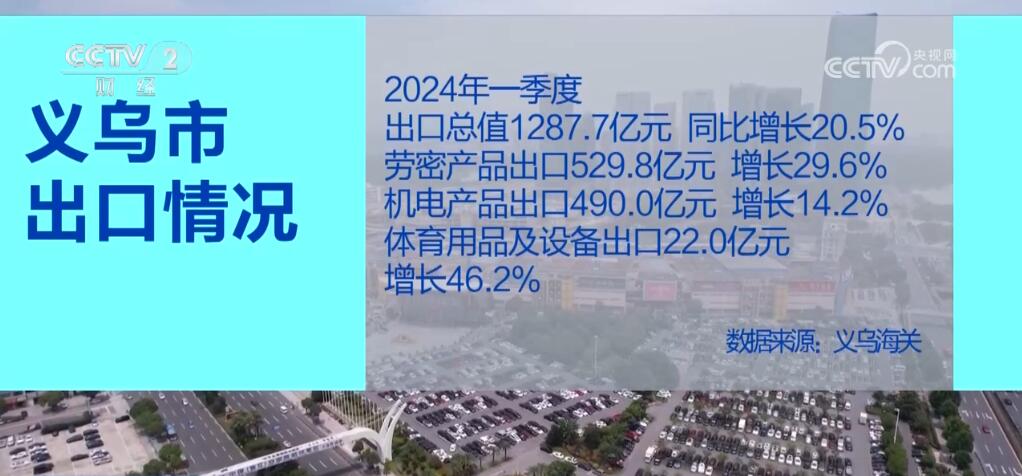 数据显示,2024年一季度,义乌市出口总值达1287.7亿元,同比增长20.5%。其中,劳密产品出口529.8亿元,增长29.6%;机电产品出口490.0亿元,增长14.2%;而体育用品及设备出口达到22.0亿元,增长46.2%。业内人士表示,巴黎奥运会即将召开,以及外商圣诞采购季开始,欧美市场补库存需求增加,使得相关产品出口占比显著提升。