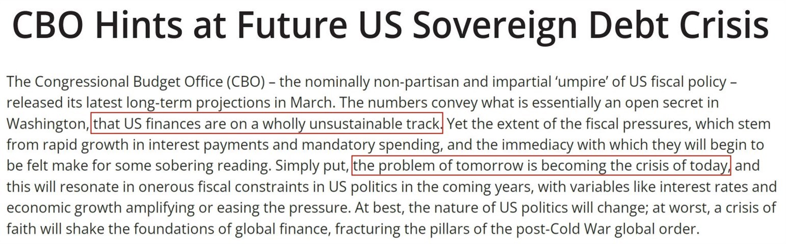 加拿大智库“地缘政治观察”日前刊文认为,美国国会预算办公室暗示未来美国主权债务危机问题将更加严重。
