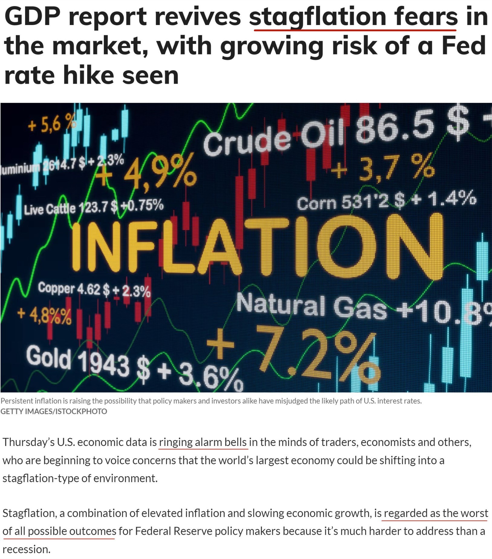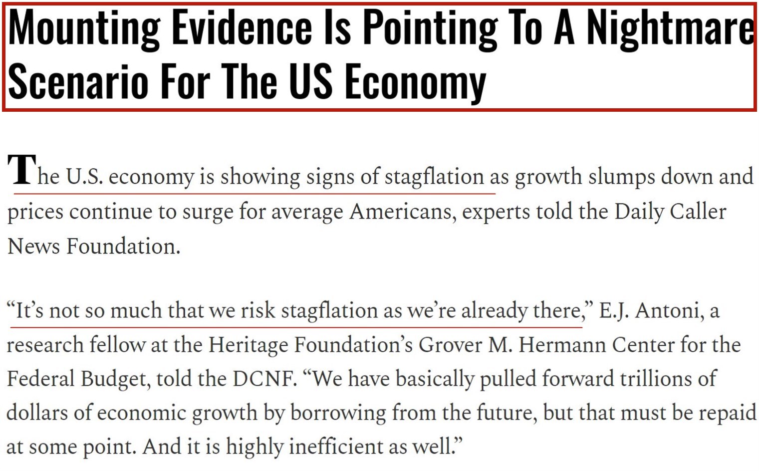多家美国媒体认为,随着美国经济增长放缓和通胀持续飙升,美国经济正显示出滞胀迹象。