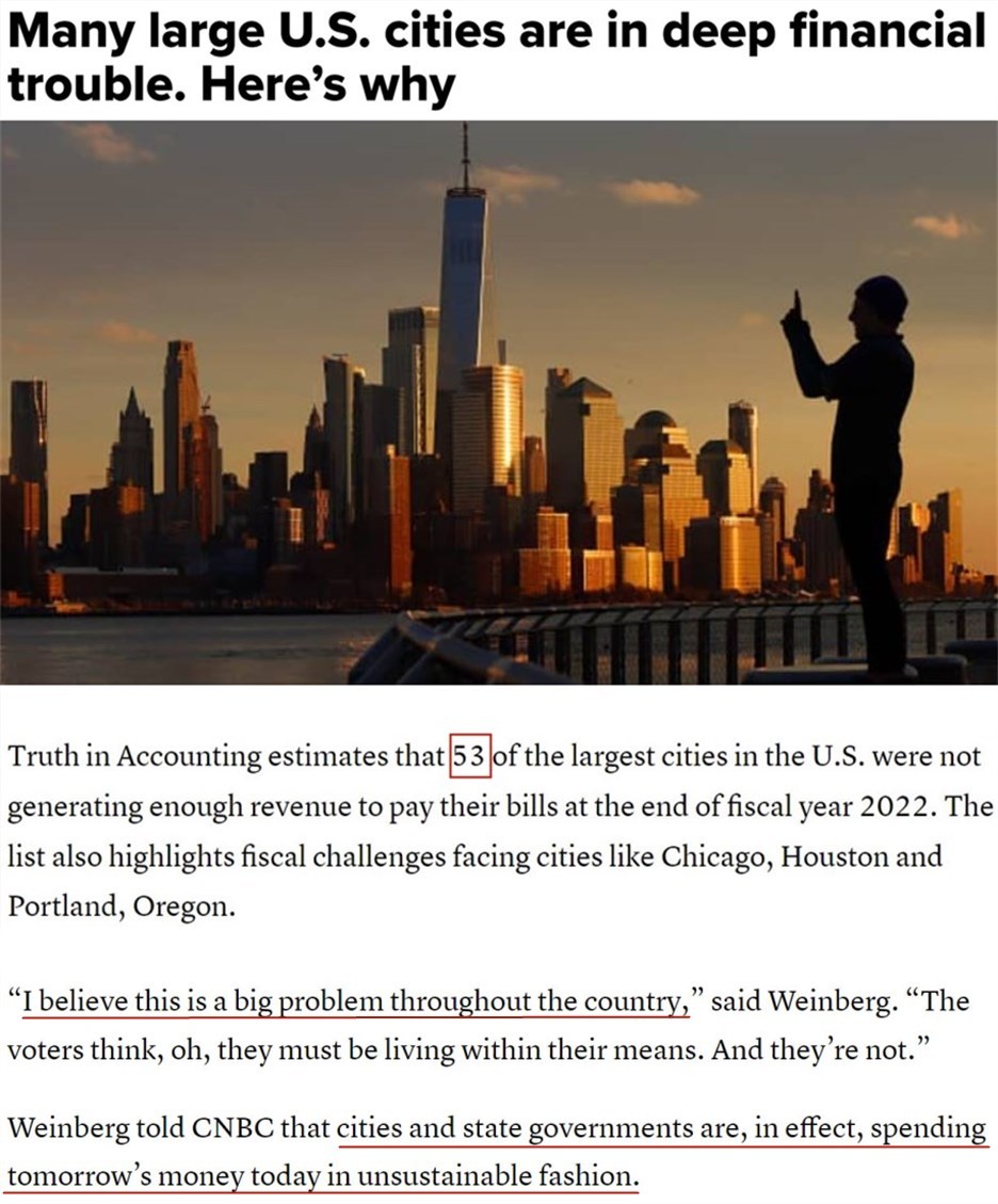 美国消费者新闻与商业频道网站日前援引非营利组织“会计真相”的分析称,在2022财年,芝加哥、费城、休斯敦、波特兰和迈阿密等城市的债务都超过了各自持有的资产。那一年,美国最大的城市中有53个没有足够的收入来支付账单。