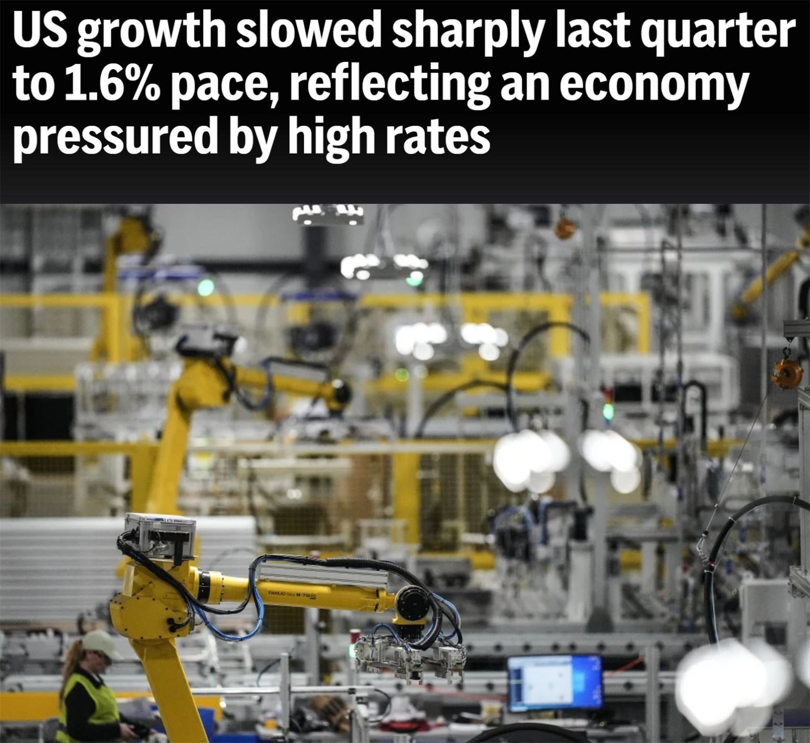 根据美国商务部日前公布的数据,今年第一季度,美国国内生产总值(GDP)增速仅为1.6%,不仅与上季度3.4%的增速相比有较大幅度的回落,也低于此前美国经济学家和市场的普遍预期,更达到了2022年第二季度以来的最低水平。